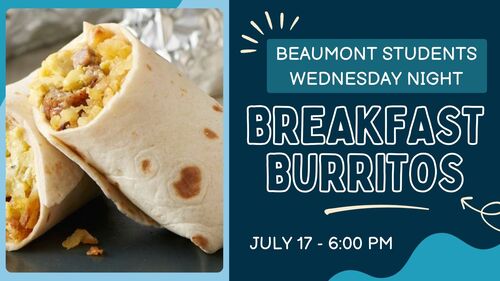 Get ready for an unforgettable Students Wednesday Night (completed grades 6-12)! Join us for delicious breakfast burritos, games, and worship. Don't miss out on this awesome event - see you there! Building 6 - upstairs (Epi-Center).