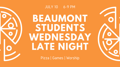 Calling all students - completed grades 6-12, come join us and kick-off "Beaumont Students Wednesday Late Night." We will have pizza, games, fellowship, and worship all rolled into one amazing night! See you there (Building 6 - upstairs)!