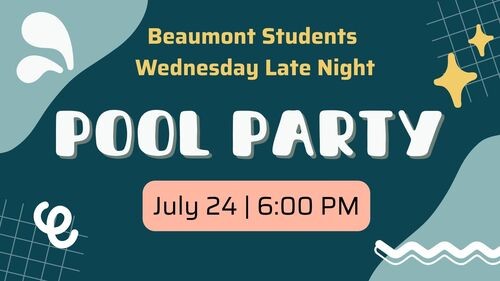 Hey BMT Students (completed grades 6-12)! Get ready for a Wednesday Late Night Pool Party! Don't forget to bring your swimsuits and towels! Remember, you must have a parental consent form on file to join us. Don't miss out on this fun event!